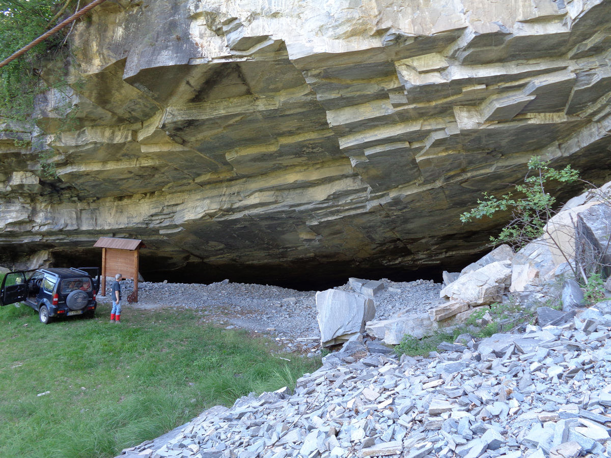 Si tratta di un'unico camerone discendente di 40 x 60 m. senza pilastri di sostegno, a conferma dell'eccezionale solidità del materiale, di cui è formata la montagna, di qualità nettamente superiore alle normali ardesie, tant'è che in alcuni tratti le lastre, di qualità quasi marmorei, erano ventute come pietra di rivestimento delle pareti e non come semplici lastre di copertura dei tetti.