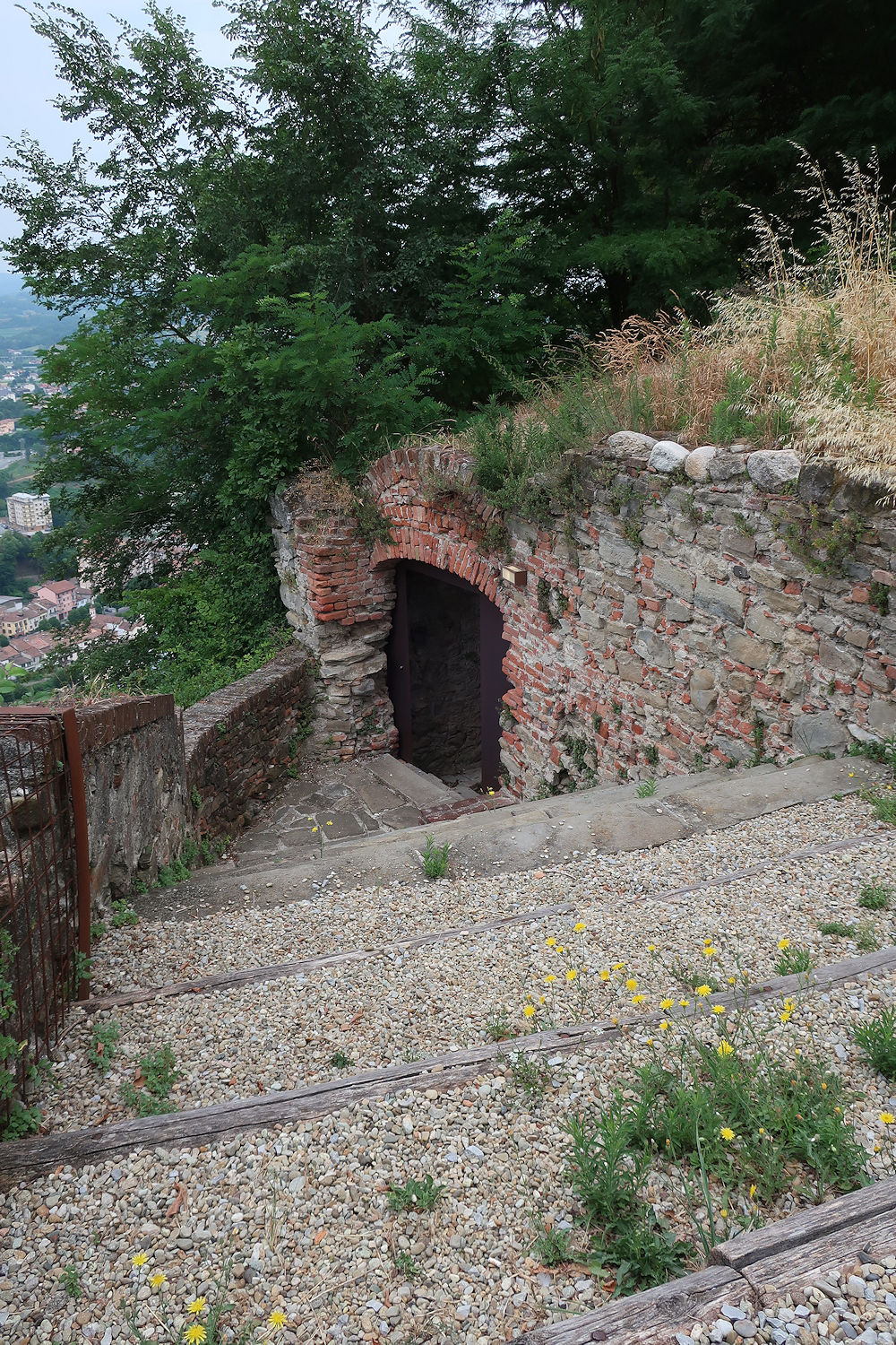 Dalla porta di ingresso una breve scalinata immette nel corridoio porincipale. Subito a destra un muro in laterizio con porta, probabilmente aggiunto nell'800, dà accesso al vano A, il più recente, scavato nell'800 ad uso militare (magazzino o polveriera). Poco oltre un altro muro in laterizio analogo al precedente dà accesso al vano B, una cappella a croce latina con transetto poco pronunciato, probabilmente l'antica cappella della Madonna della Guardia citata negli scarnu documenti storici. Proseguendo sempre sulla destra si apre un modesto slargo (vano D) corrispondente ad un'altra modestissima cappella. Il corridoio sbuca poi nell'ambiente principale (vano E) che costituiva uno spazio di raccordo fra l'ingresso antico sulla sinistra (l'attuale vetrata affacciata su Ceva), la cappella sulla destra (quella meglio conservata dell'intero complesso, e i vicini ambienti F e G che all'epoca si aprivano direttamente su questo ambiente con ampie arcate aperte. Attualmente le arcate verso l'ambiente G sono completamente murate, mentre quella verso il vano F è stata chiusa lasciando solo una porta d'accesso. Si prosegue in un breve corridoio (realizzato per sostituire l'accesso diretto dal vano E al vano G all'epoca in cui questo fu murato) che si sdoppia quasi subito, a sinistra verso una porta (chiusa) che dava accesso a un piccolo terrazzo affacciato su Ceva, a destra verso l'ampio vano G, dal quale si accede poi al vano H. In quest'ultimo una porta attualmente chiusa immette sullo stesso terrazzo accessibile dal corridoio. Insertion date