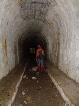 Da qui inizia il tratto propriamente sotterraneo, una galleria lunga un centinaio di metri scavata nel sovrastante promontorio roccioso, in leggera discesa, che porta ai locali dove venivano confezionate le cariche e dai quali ci si affaccia sulla valle. Da qui un sentiero ormai difeso da un muro di ortiche conduceva alla vicina polveriera, non esplorata nel corso della nostra visita.