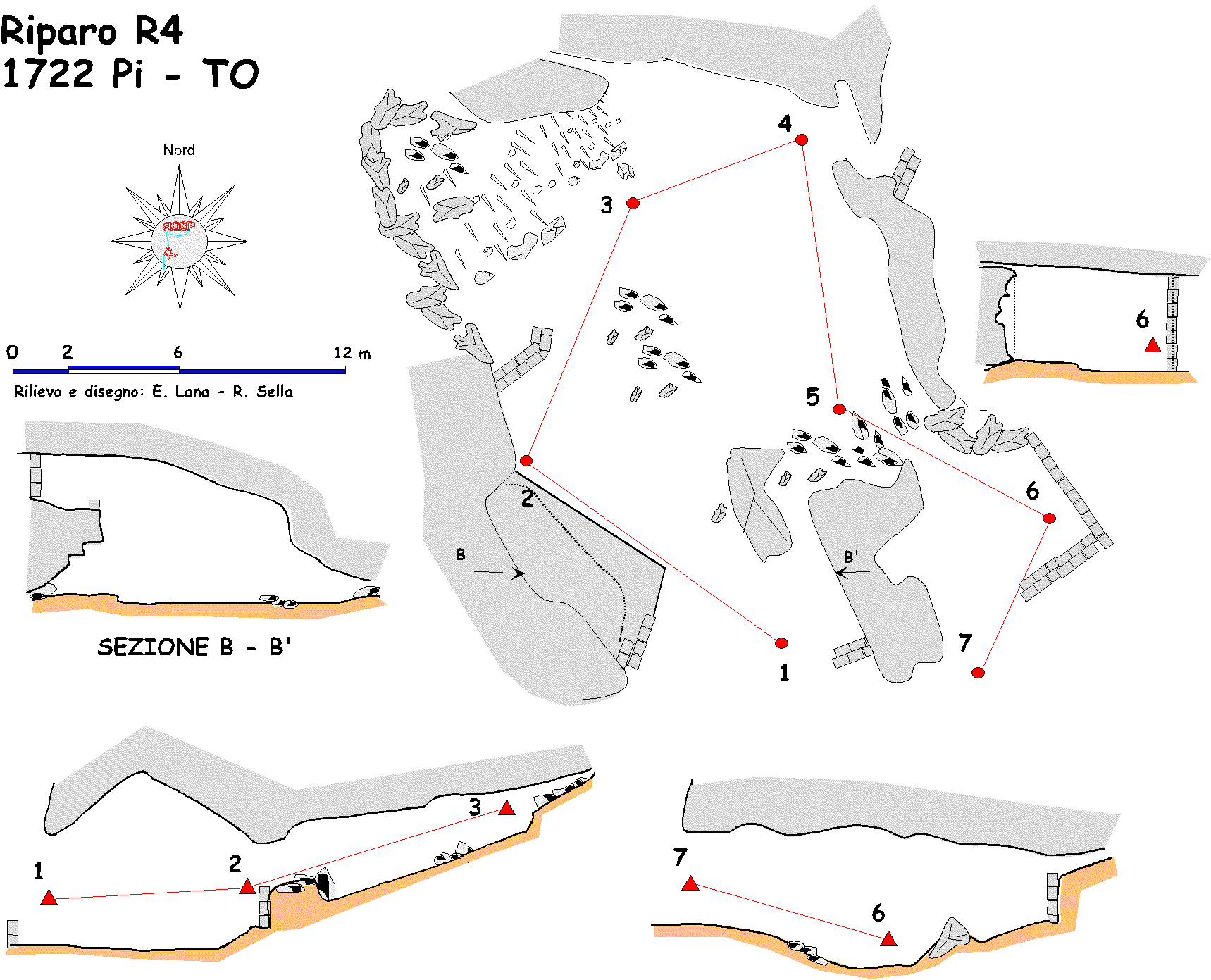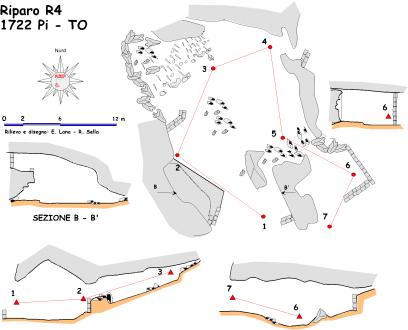 Con i circa 1000 m² di superficie coperta è il più vasto dei ripari studiati. I vani utilizzabili sono almeno quattro, tra di loro intercomunicanti, tre gli ingressi di cui uno, in posizione elevata. Da notare che, come per R3 è stato ricavato uno spazio protetto ed utilizzabile a contatto del soffitto. (tratto da: Panta Rei - Antologia 2001-2014)