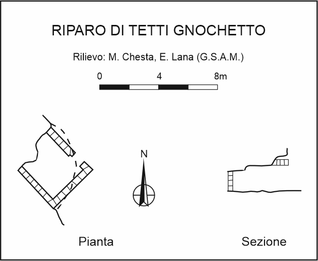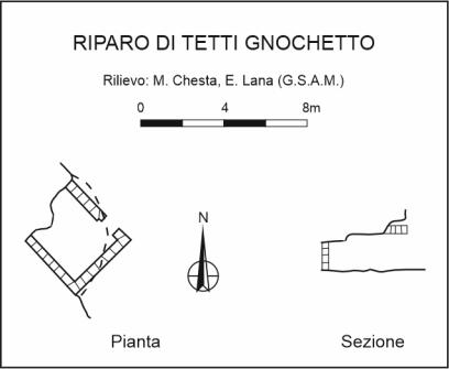 Riparo antropizzato di pochi metri sotto un grosso masso davanti al quale è stato eretto un muro con porta e finestra (E. Lana).
