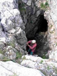 Si apre con un vistoso ingresso su un pozzo cui segue un ripido scivolo detritico, al fondo del quale un vecchio spit testimonia di visite precedenti, che sembrano comunque essersi arrestate in questo punto. Superato l’unico passaggio stretto della grotta (superabile comunque anche da speleologi discretamente robusti) un saltino di un paio di metri immette in una lunga sala impostata lungo la frattura che forma l’intera cavità. Verso il fondo della sala nel pavimento si apre l’imbocco di un meandrone discendente, con larghezza costante di un metro o più, e altezza che a tratti si perde nel buio. Si alternano brevi salti e ripidi scivoli, poi la frattura sprofonda verticale. L’abisso sembra ormai a portata di mano, invece il pozzo si arresta bruscamente su un pavimento coperto di frana, probabilmente in corrispondenza di una discontinuità tettonica. La grotta si presenta insolitamente pulita e sicura rispetto a quanto succede usualmente per questo tipo di cavità tettoniche: poco il detrito e le frane sospese, piuttosto stabili (da Mondo Ipogeo n. 16).