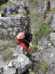 L'ingresso a fessura (m 4X1) da su un pozzo verticale di m 27 (scaletta necessaria), dapprima stretto e irregolare, poi aprentesi a campana con pareti lisce. Alla base (m 8 X 4) un cumulo di pietrame digrada verso una fessura: a sinistra si scende in essa su blocchi· di frana; segue un salto di m 4 (scaletta utile), oltre il quale non si prosegue che per pochi metri (camino verticale); a destra si risale tra le strette pareti rivestite di concrezioni calcaree fino ad un pozzetto chiuso di m3. (tratto da: Speleologia del Piemonte - Parte II: il Monregalese)
