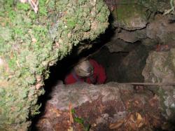 L'ingresso, di m 0,5 X 0,7, si trova in un bosco, fra blocchi di calcare rivestiti di muschi e licheni. Ad esso segue subito un pozzo-fessura, largo m 0,4-1, che scende verticale per 9 metri; la fessura è chiusa da materiali clastici e da argilla, ma si può scendere ancora un po', fino a una profondità totale di 15 metri; la larghezza massima del pozzo è di 11 metri.