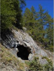 noduli in condotti appena percorribili, entro i quali confluiscono altri canali non esplorabili, per le ridottissime dimensioni, ma sempre butterati di noduli (cap. n e m). Per questo, riteniamo che in origine il Trou potesse essere un complesso di condotti carsici, tra di loro paralleli e sovrapposti, già naturalmente comunicanti tra di loro in più punti ed accessibili dall'attuale ingresso. Una conferma di quanto affermato si ottiene visitando la "galleria di ribasso" che, fatta eseguire dal "permissionario", si apre tra Chapy e La Trappe. Al fondo di questa che misura circa 3 O m, si raggiungono i condotti alla base dell'affioramento dove è possibile osservarne la morfologia freatica; il diametro è di poco inferiore al metro ed è completamente ostruita da detriti minuti dai quali scaturisce una tenue vena d'acqua utilizzata come acquedotto a La Trappe. La prossimità di questi condotti ad una delle più importanti faglie della regione può aver determinato, infatti, fasci di fratture parallele alla stessa, lungo le quali devono poi aver lavorato intensamente le acque provenienti dall'ampio bacino delimitato dai valloni meridionali del Mont de la Saxe e da quelli occidentali del Col du Sapin. Questa tuttavia è solamente la più speleologica delle varie ipotesi che si possono formulare, potendone enunciare altre che contemplano la corrosione chimica per sviluppo di acidi o rapidi raffreddamenti verificatisi nel processo metamorfico delle rocce. L'uomo ed il tempo hanno poi fatto il resto, il primo, asportando il minerale lungo le direttrici su cui si espandono le lenti di rocce mineralizzate, il secondo, rinaturalizzando aree certamente antropizzate. Le mineralizzazioni presenti sono molteplici (dalla baritina allo zolfo, dalla galena allo ialofane, ecc) mentre sono quasi completamente assenti le concrezioni calcaree, limitate a circoscritte incrostazioni. L'orientamento dei condotti si sviluppa da SW a NE con inclinazione prevalente attorno ai 3 5°i i piani di scistosità, dove sono osservabili, sono perpendicolari alla direzione dei condotti (con quasi identica inclinazione) e, su tali piani, si sviluppano ulteriori cunicoli che determinano l'andamento "labirintico" del Trou des Romains. Ouesta particolarità, ampiamente descritta dal de Robilant nel 1784, si adatta solamente ad una parte (molto prossima all 'attuale ingresso) e neppure molto estesa dell'intero complesso. L'attuale fondo, all'estremità est della cavità, si sviluppa invece in una galleria ampia, di chiara origine mineraria, per niente labirintica. Dall'ingresso (cap. 1) si penetra, in direzione NW, nella galleria superiore, ampia ed alta verso NE dove gli interventi minerari sono evidenti almeno fino al cap. B. In realtà, superiormente, si possono ipotizzare ancora due condotti paralleli, in parte arrampicabili ed interrotti da frane. A monte del cap. B la frattura sembra naturale fino al fondo chiuso da una frana con massi di notevole dimensione. Il tratto tra i cap. B e C può essere annoverato tra quelli in cui il naturale e l'artificiale si confondono e s'intersecano. Certamente naturale è invece il tratto prevalentemente verticale (indispensabile l'armo del pozzo finale) che, senza l'ostacolo rappresentato da una frana, raggiungerebbe il condotto di base in prossimità del cap. F. Verso SW (cap. da G a D) la galleria ha la volta e la parete a monte priva di segni di lavorazione, mentre, specialmente sul pavimento, la posa di alcune travi denota sicure modificazioni alla conformazione naturale. Da D ad I i lavori di miniera sono stati vistosissimi, creando un'ampia galleria che taglia sia a destra che a sinistra i condotti originari. Verso sinistra, i lavori hanno interessato i condotti ascendenti con la formazione di una galleria, sottostante a quella d'ingresso, che raggiunge l'estremità NE della cavità, risultando in collegamento con quella superiore in diversi punti, a conferma della descrizione fatta dal de Robilant. In tutto il tratto finora descritto c'è da sottolineare la quasi completa assenza di detriti. Verso destra invece i condotti (tutti discendenti) hanno dimensioni più modeste ove, in molti tratti, si è costretti a strisciare in mezzo alla gran massa di detriti che vi sono stati scaricati e che è causa di alcune ostruzioni. Hanno questa morfologia i cunicoli che si diramano dal cap. A2B e che raggiungono l'estremità occidentale del complesso. Il fondo di tali cunicoli è chiuso da terriccio e detriti fini e, nelle esplorazioni del 2001, su tale fondo venne rilevata una forte corrente d'aria e l'unico torrentello della cavità: un rivolo con portata di pochi litri al minuto che s'insinuava tra i detriti. Nel 2008, tale area era occlusa da una frana terrosa tanto compatta da interrompere anche il flusso d'aria. Non si è avuto il tempo di andare a verificare se questa abbia anche determinato delle variazioni alla portata dell'acquedotto di La Trappe. Quasi al fondo della galleria mineraria centrale, sulla destra, un tortuoso passaggio in frana permette di accedere verso le parti a più bassa quota. Nel primo tratto, naturale ed antropico si sovrappongono. Poi, mano mano che si procede, l'opera umana prende il sopravvento, finché si sfocia, poco a monte del cap. G, nella galleria di base, chiaramente artificiale e che doveva sbucare all'esterno, in corrispondenza dell'ingresso della miniera, circa 60 metri più in basso dell'ingresso naturale. La galleria taglia numerosi camini che s'insinuano verso l'alto e la cui esplorazione potrebbe ancora offrire sorprese. A metà circa di questa galleria, sono state scoperte alcune incisioni, tra le quali una data: "1554" tracciata con la grafia dell'epoca. (tratto da: Panta Rei - Antologia 2001-2014) Itinéraire