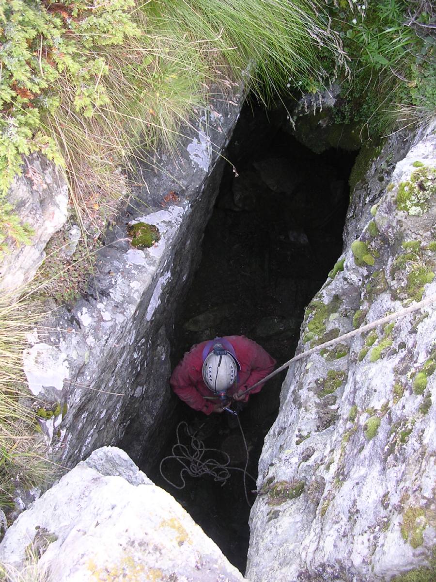 L'ingresso si apre a pozzo facilmente superabile in liberei. La cavità è impostata sull'intersezione di più fratture che hanno fortemente sezionato l'affioramento.