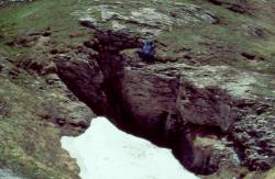 Dolina-pozzo con fessura suborizzontale al fondo, chiusa da terriccio; notata lieve corrente d'aria in uscita (agosto '84)