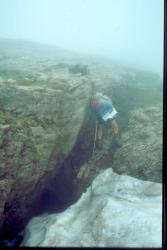 Dolina inghiottitoio con molto detrito e fessura impraticabile alla base, da cui soffia leggera corrente d'aria (agosto '84).