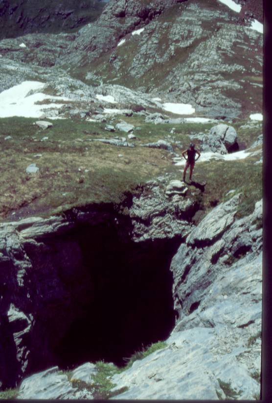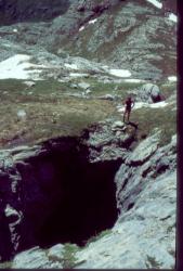 La notevole dolina di accesso prosegue in un pozzo di una trentina di metri, dal quale si accede a grandi ambienti, spesso occupati da neve. Inverni particolarmente asciutti permettono di proseguire attraverso un ampio pozzo, che presenta nevai pensili e che andrebbe esaminato con attenzione vicino alle pareti. A circa -70 m di profondità, le possibilità di proseguire sono legate alle dimensioni dei passaggi fra i cumuli di neve.