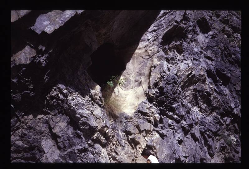 E' un condotto freatico sezionato dal taglio e dall'approfondimento della Gola, con ampio ingresso a sez. subcircolare e chiare morfologie freatiche: il primo tratto fortemente ascendente è in parte occupato da depositi alluvionali terrigeni e da ciottoli centimetrici arrotondati, residui di riempimenti trasportati con tutta probabilità dal Rio di Upega nei primi periodi di intaglio della Gola. La cavità è costituita da un relitto di condotto subcircolare a pieno carico, con asse lungo il piano di frattura, che si abbassa progressivamente intasato da depositi terrigeni-sabbiosi, Sulle pareti la morfologia freatica è evidenziata da larghi "scallops" ed alveolature. A N-E lungo il piano di frattura modificato da erosione-corrosione uno stretto passaggio ascendente porta al ridottissimo ingresso superiore. Degne di nota le evidenze di neotettonica rappresentate da uno spostamento di 40/50 cm dei lembi della litoclasi generatrice. (BOLLETTINO GSI N. 22) L’ingresso, grande condotto freatico a sezione subcircolare, sezionato dall’approfondimento della Gola, con grandi depositi alluvionali terrigeni e ciottolosi (diametri anche decimetrici) dovuti al paleo Rio di Upega, si apre ca. 6 metri sopra il piano stradale, appena a monte dell’ultimo paravalanghe. La condotta forzata (con sculture ad alveoli e scallops) dapprima ascendente tende a suborizzontale, intasata, dai riempimenti (1984). A destra (NE) lungo il piano della frattura principale uno stretto passaggio ascendente (modificato dalle acque di percolazione) comunica (ridottissima fessura) con l’esterno: il piano della litoclasi presenta evidenze di neotettonica (spostamento di 40 – 50 cm dei lembi della frattura). Dal 1984 a fasi alterne si è portato avanti (anche da parte di speleologi genovesi), sino al 2000, lo svuotamento della condotta per una quindicina di metri: la galleria mantiene i caratteri di condotta forzata (ad andamento discendente) sviluppata sempre lungo il piano della frattura fortemente inclinata a direzione appross. Est (subparallele a quelle del Lupo inf.). È la stessa litoclasi del Garb del Butaù: la Cavernetta si sviluppa sopra il torrente tra Butaù e Lago Caldo del Lupo. Nell’ultima parte dell’attuale scavo lungo la frattura è netta la corrente d’aria, che potrebbe indicare una comunicazione con la via dell’acqua. Auteurs de la description