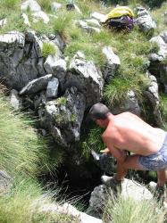 Numero:875;Nome:Pozzo Omega-2 degli Stanti;Altra denominazione:Abisso 5000;Regione:Piemonte;Provincia:CN;Comune:Ormea;Area carsica:Cima Verzera;Sistema carsico:Mottera;Latitudine:408383;Longitudine:4894154;Datum:UTM WGS84;Convertite da:UTM ED50;Quota altimetrica (m.slm):1850;Posizione verificata su campo da curatore:Massimo Sciandra;Sviluppo reale (m):215;Sviluppo planimetrico (m):112;Dislivello negativo (m):126;Dislivello totale (m):126;Note idrologiche:Fossile, qualche isolato stillicidio;Note meteorologiche:aspira debole in estate;Data aggiornamento catastale:09/11/2018;Note_:N.C.;Itinerario:Da Ormea si raggiunge l'abitato di Cascine, da cui si percorrono 16km di strada sterrata, fino alle Celle degli Stanti. Si prosegue quindi con il sentiero che, a mezza costa, percorre la dorsale in direzione nord. Giunti in prossimita di un'evidente cavità (Buco di Dino) si abbandona il sentiero per scendere lungo la massima pendenza, fino all'ingresso dell'abisso 5000.;Immagine ingresso:Si;Altre immagini:No;Rilievo:Si;