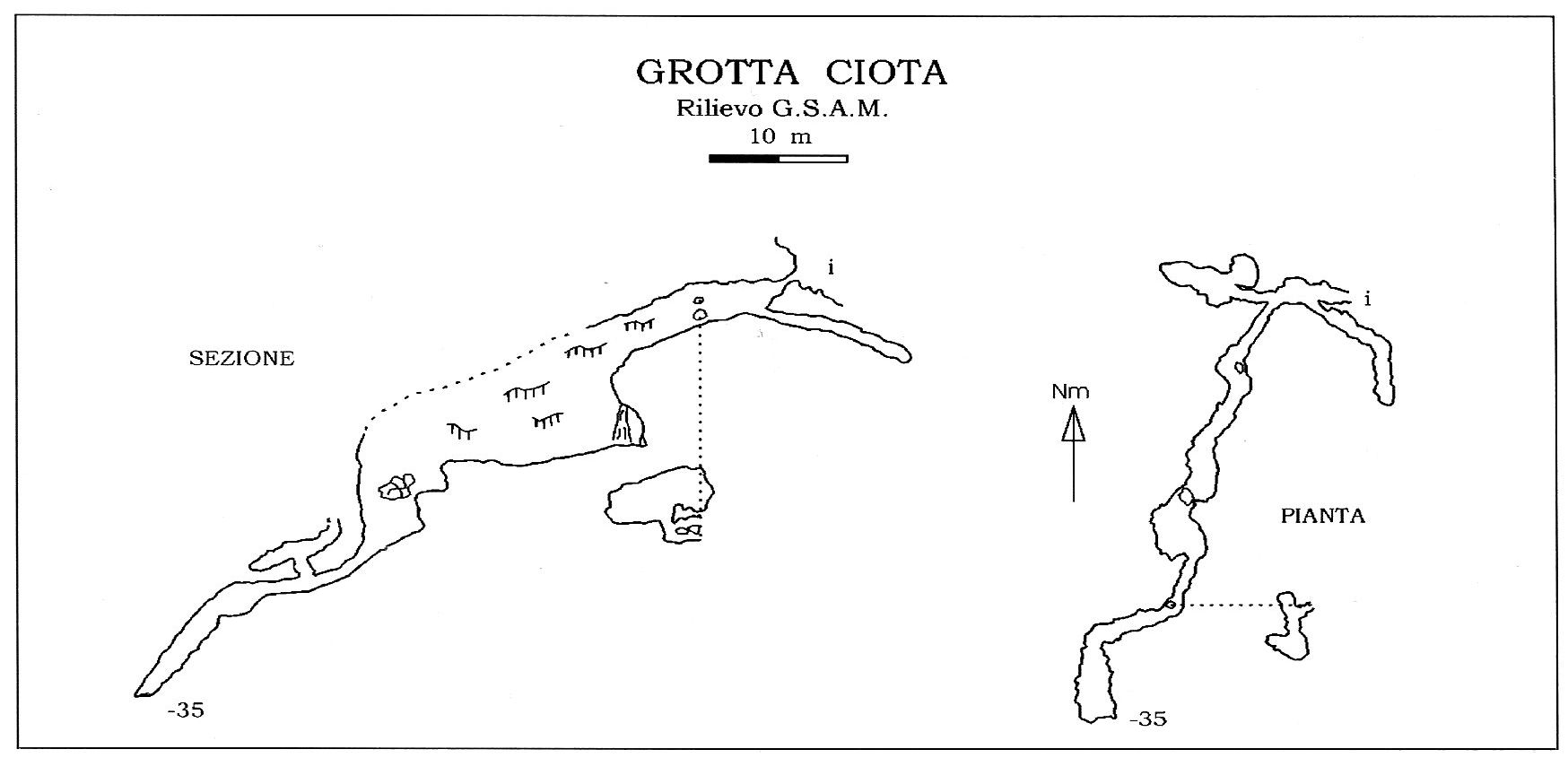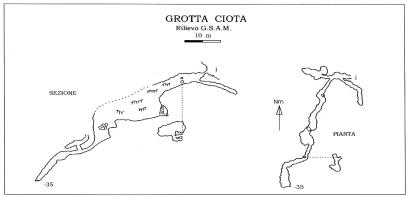 Numero:1174;Nome:Grotta Ciota ;Regione:Piemonte;Provincia:CN;Comune:Valdieri;Toponimo locale:Comba dell'Infernotto;Area carsica:Roccavione - Palanfré;Latitudine:373368;Longitudine:4901753;Datum:UTM WGS84;Convertite da:UTM ED50;Quota altimetrica (m.slm):1150;Sviluppo reale (m):105;Dislivello negativo (m):35;Dislivello totale (m):35;Note_:N.C.;