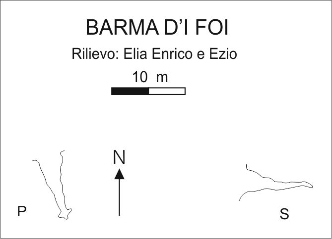 Numero:1245;Nome:Barma d'i Foi;Regione:Piemonte;Provincia:CN;Comune:Macra;Toponimo locale:Alma;Area carsica:Lauset - Stroppo;Latitudine:354498;Longitudine:4928782;Datum:UTM WGS84;Convertite da:UTM ED50;Quota altimetrica (m.slm):980;Sviluppo reale (m):9;