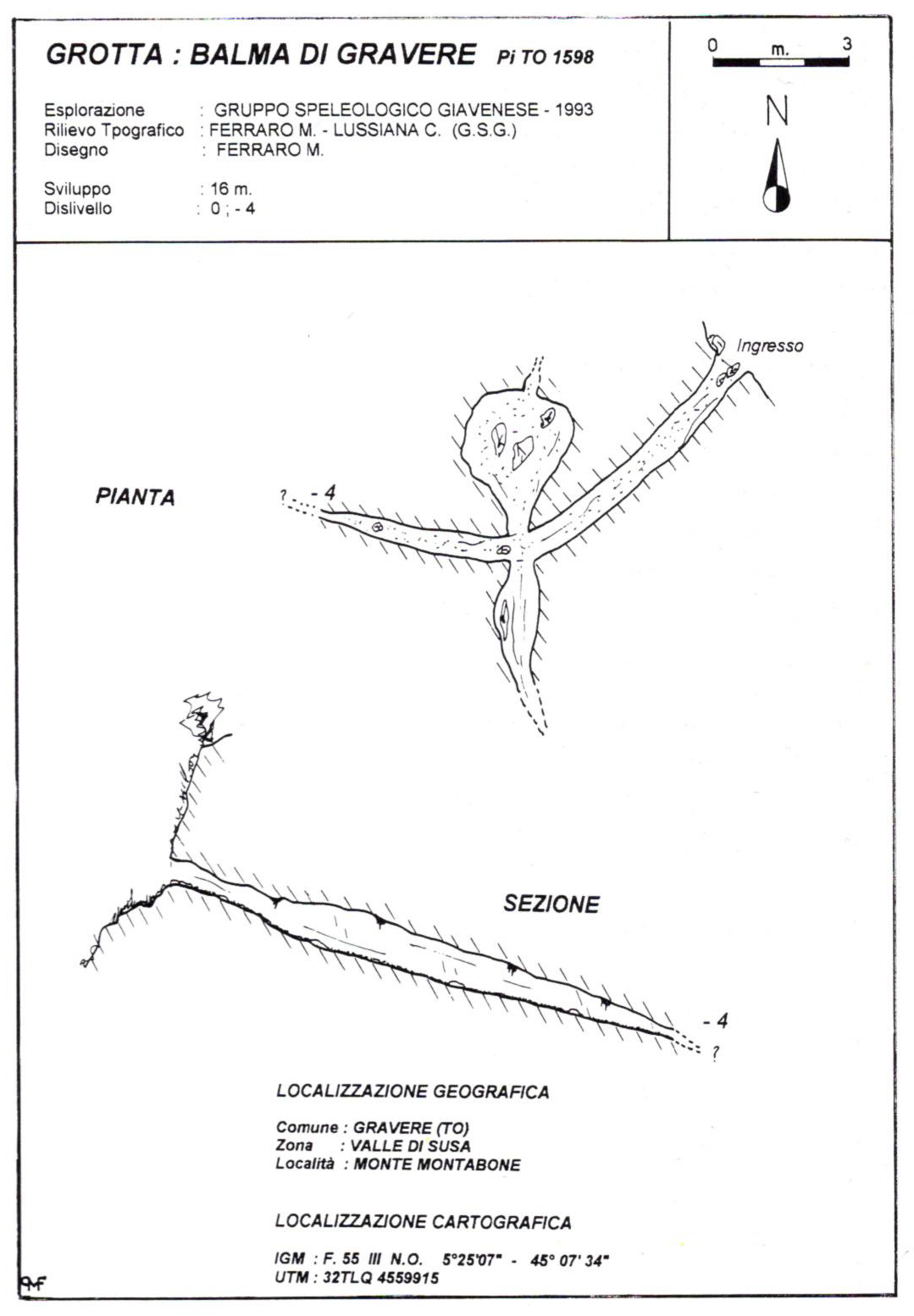 Numero:1598;Nome:Balma di Gravere;Regione:Piemonte;Provincia:TO;Comune:Gravere;Area carsica:Meana;Latitudine:345340;Longitudine:4998920;Datum:UTM WGS84;Convertite da:UTM ED50;Quota altimetrica (m.slm):850;Sviluppo reale (m):16;Dislivello negativo (m):4;Dislivello totale (m):4;Note_:N.C.;