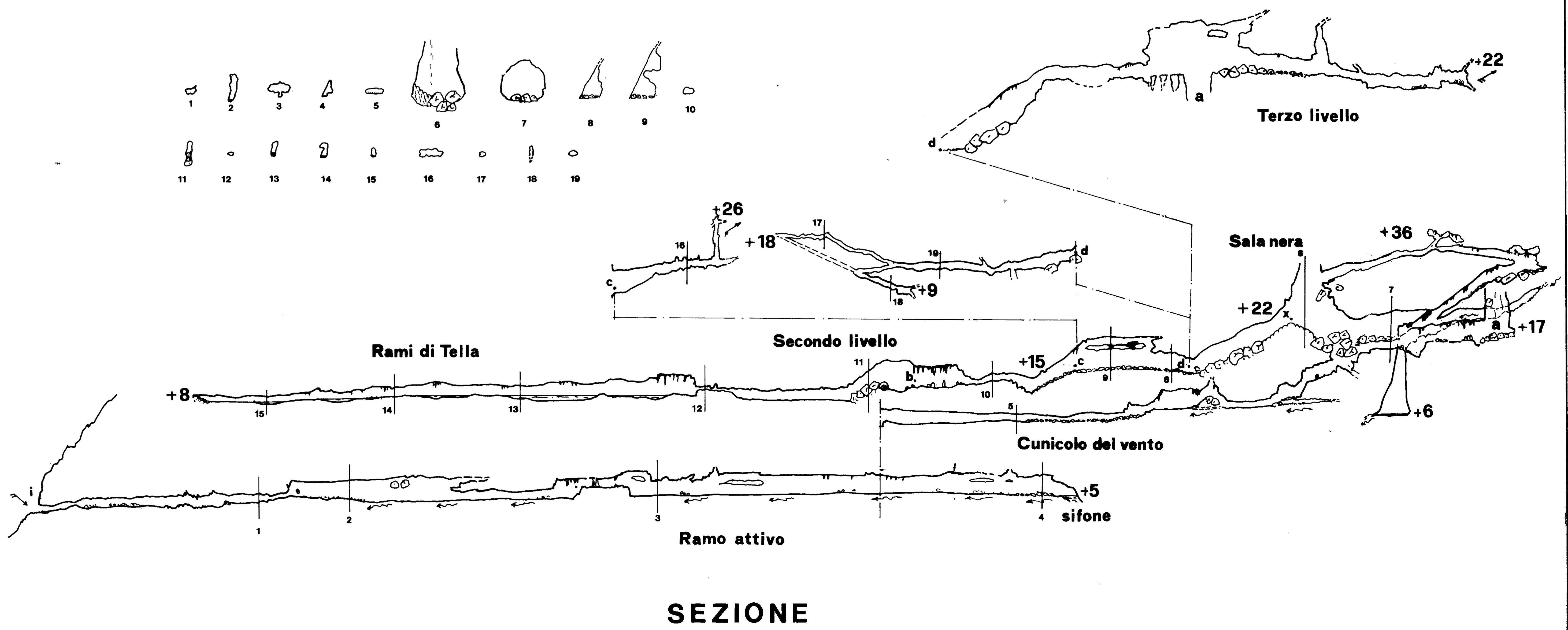 La cavità è una tipica risorgenza, articolata su tre livelli di cui il più basso attivo. È aspirante nei mesi invernali, percorsa da una forte corrente d’aria (funziona da ingresso basso). (tratto da: Atlante delle aree carsiche piemontesi - Volume 2 (2010)