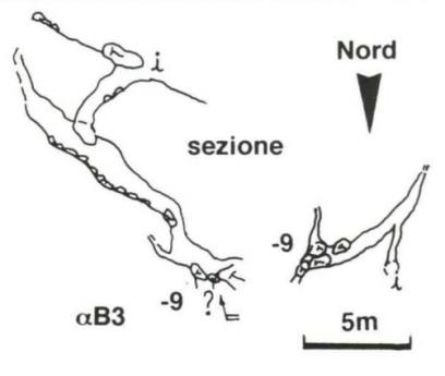 Meandro nel Trias di 8 m con strettoia sul fondo disostruita per alcuni metri da continuare ad allargare, forte aria soffiante.