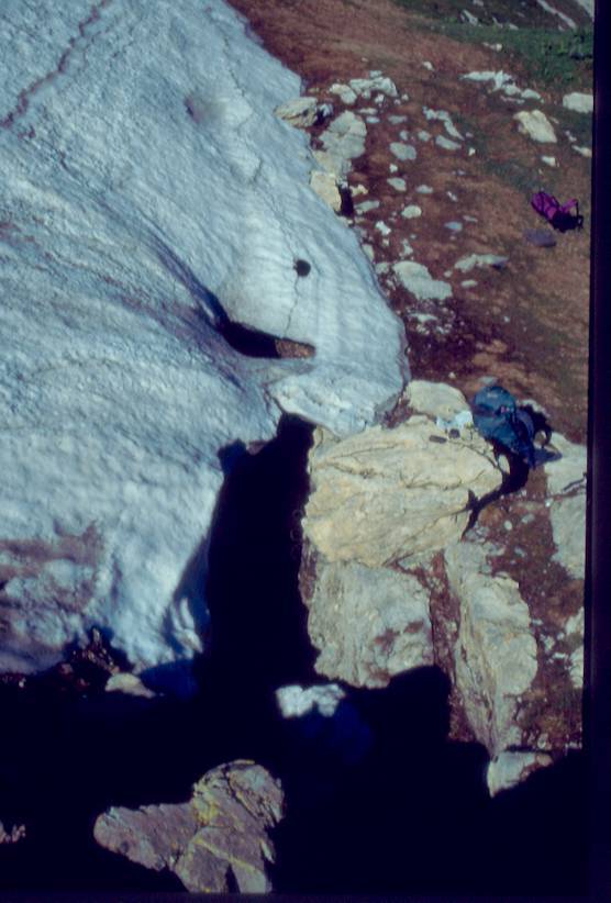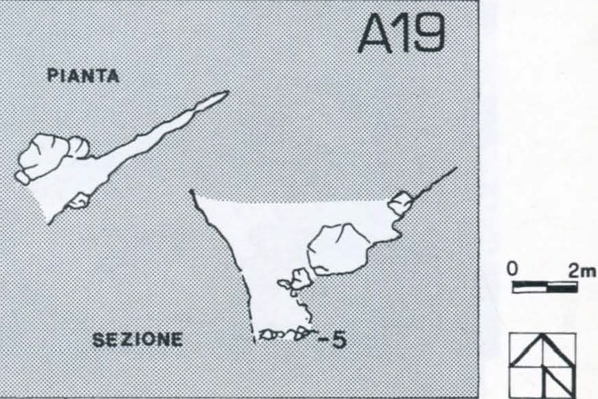 Fessura con massi instabili e forte stillicidio proveniente dal nevaio soprastante; segue pozzetto di 2 metri con terriccio e pietre al fondo.
