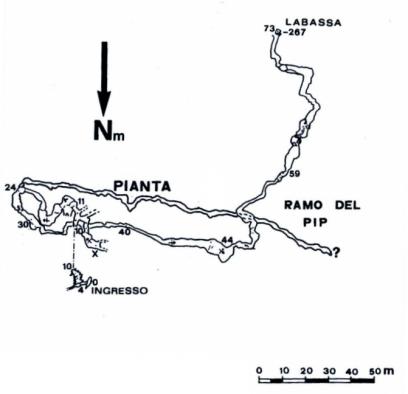 Dal P50 segue verticale fino al Pozzo dell’Aereo-Coniglio che, con un meandro con acqua e laghetti, porta ad una galleria concrezionata da dove si sbuca direttamente nella galleria del Fiume dei Mugugni a Labassa. (la (tratto da: Atlante delle aree carsiche piemontesi - Volume 2 (2010)