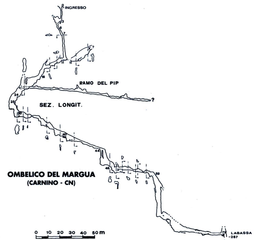 Numero:3358;Nome:Grotta Ombelico del Margua;Regione:Piemonte;Provincia:CN;Comune:Briga Alta;Toponimo locale:Carnino, Chiusetta;Area carsica:Marguareis - Pian Ballaur - Saline;Complesso carsico:Complesso Labassa-Ombelico del Margua;Latitudine:395865;Longitudine:4889676;Datum:UTM WGS84;Convertite da:UTM ED50;Quota altimetrica (m.slm):1878;Dislivello negativo (m):650;Dislivello totale (m):650;