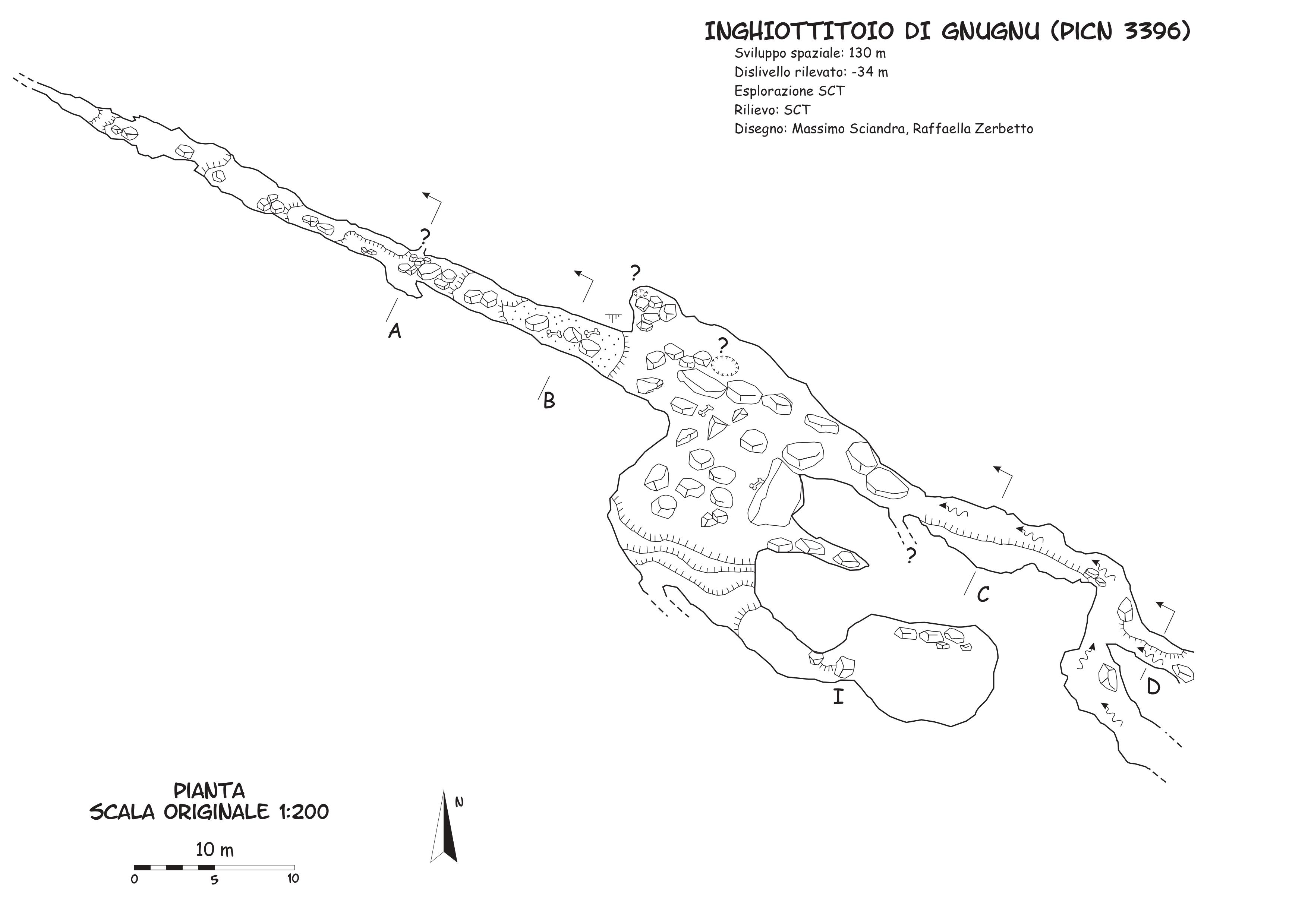 L'ingresso è costituito da una grossa dolina cui segue una verticale di 25 metri, a cui si accede da uno stretto passaggio parzialmente ostruito da massi. La progressione si effettua su corda e la calata, dopo i primi 15 metri di condotta fortemente inclinata, prosegue verticalmente fino a raggiungere la base del pozzo; lasciate le corde si continua percorrendo il conoide di frana. Al fondo della piccola sala, superato un grosso accumulo sabbioso, si giunge nel meandro dell'a-valle che prosegue con successivi restringimenti, fino a chiudere su passaggi intransitabili. La zona a-monte della sala è stata esplorata e solo parzialmente topografata, chiudendo anch'essa su strettoie intransitabili (testo: Massimo Sciandra; tratto da: SCT News n.2).