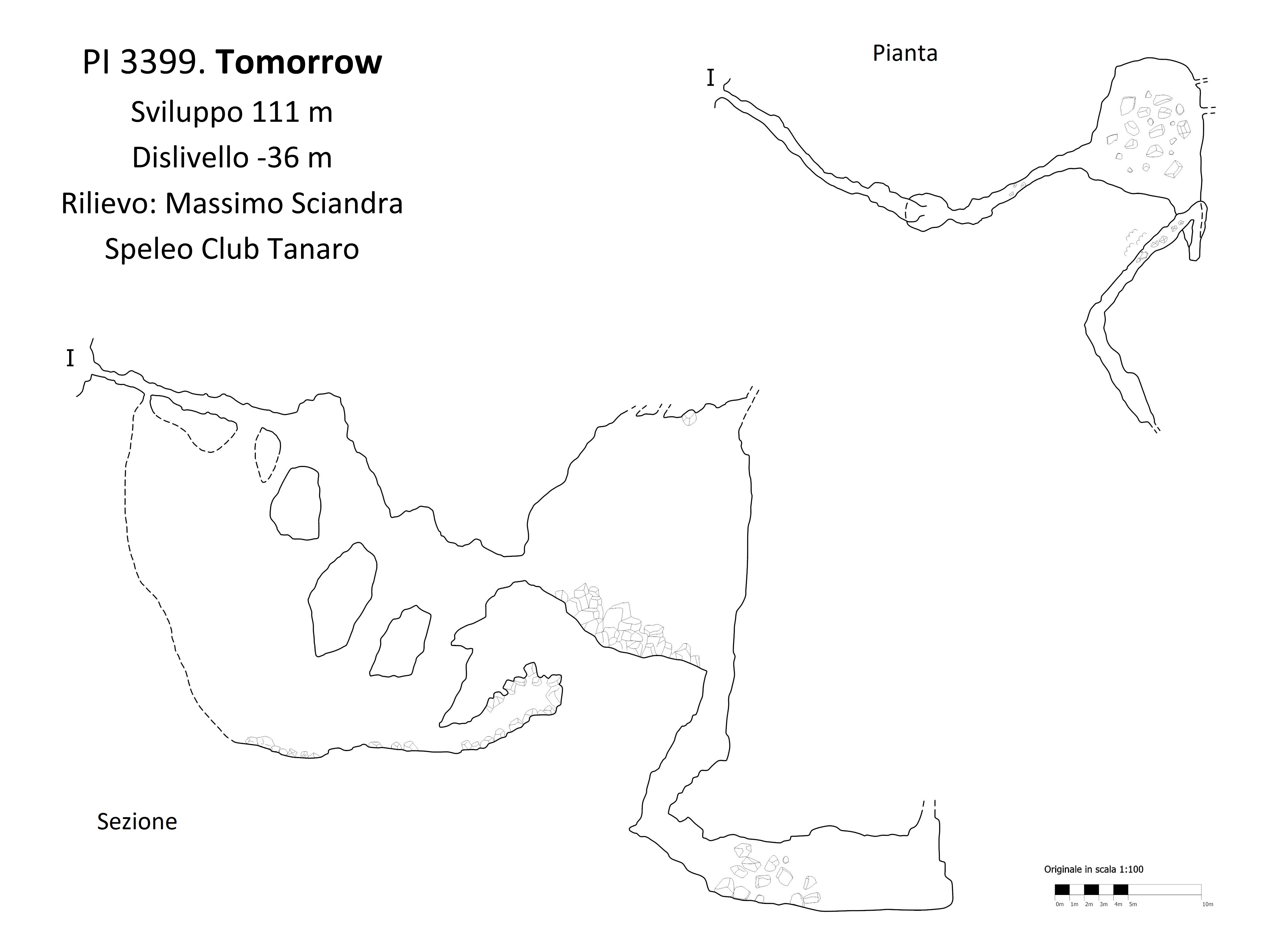 Numero:3399;Nome:Tomorrow;Regione:Piemonte;Provincia:CN;Area carsica:Cima Verzera;Latitudine:414941;Longitudine:4892694;Datum:UTM WGS84;Convertite da:UTM ED50;Posizione verificata su campo da curatore:Massimo Sciandra;Sviluppo reale (m):111;Sviluppo planimetrico (m):70;Dislivello negativo (m):36;Dislivello totale (m):36;