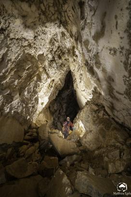 La galleria orientale si sviluppa per 60 m, è un semplice scivolo ingombro da blocchi e detriti.