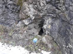 La cavità si apre sul ciglio del primo tornante della Strada Statale del Colle San Bernardo.
