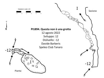 La dolina si trova nei pressi del contatto con l'impermeabile ma è stata risparmiata dall'ingresso di massi quarzitici. La cavità è comunque piena di detriti calcarei, anche di grandi dimensioni. Un'imponente scavo ha portato all'esplorazione di circa di 10 metri, accedendo ad una frattura intasata che verosimilmente è parallela al pozzo principale, che risulta completamente intasato.