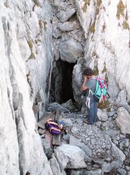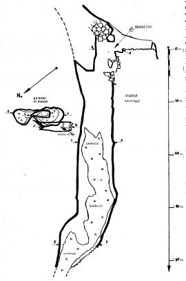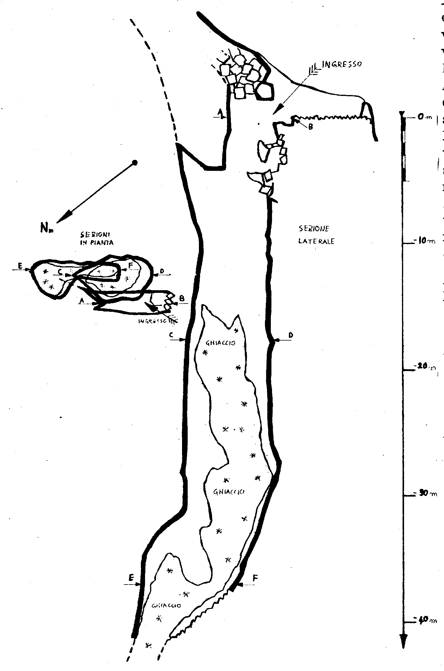 Nel tratto inferiore l'ambiente si allarga nel senso della frattura, costituendo un vano ad asse verticale parallelo al pozzo, mentre ad SO affiorano, ai lati della conoide di ghiaccio, clasti di varie dimensioni degradanti verso NE, dove la progressione rimane bloccata dal restringersi dello spazio fra ghiaccio e roccia: il pozzo però continua, Le pareti presentano una morfologia da erosione da veli d'acqua (scanalature verticali) e, meno segnatamente, di crollo, pur con una lieve accentuazione di quest'ultima man mano che si scende. Al di sotto del livello ordinariamente occupato dal conoide nevoso, le pareti. presentano levigature, da attribuirsi, forse, a un'azione abrasiva del ghiaccio; concrezioni assenti (tratto da: Stalattiti e Stalagmiti n. 15; testo: F. Tampelloni, G. Donzellini).