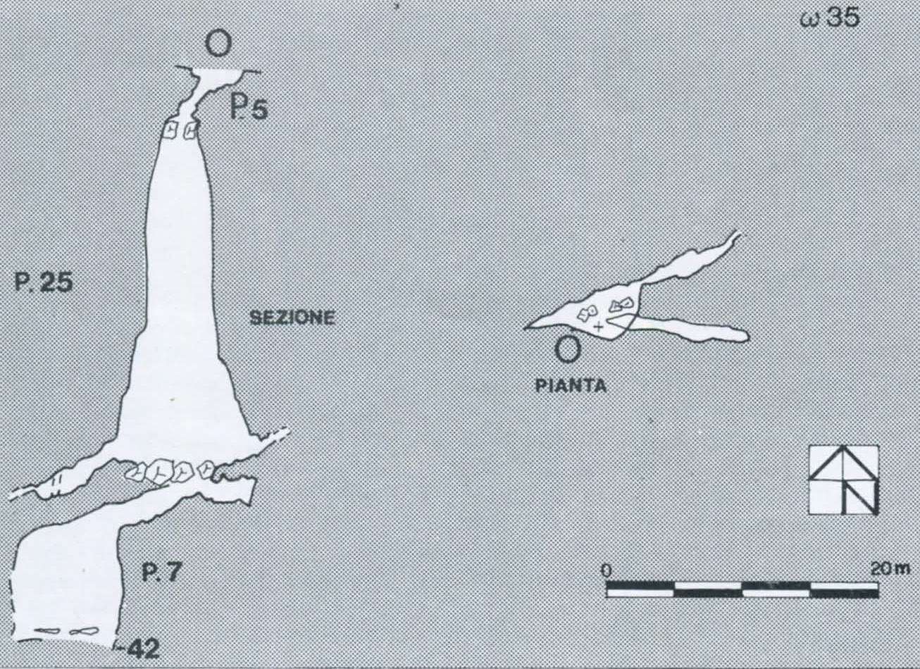 Grotta profonda 42 m, costituita da una serie di pozzi (5-25-7) che chiude inesorabilmente in fessura. La cavità si apre nei calcari del Trias ed è dovuta all'allargamento legato alle acque di percolazione su due fratture molto evidenti; la corrente d'aria che la percorre risente notevolmente delle condizioni atmosferiche esterne; le possibilità di prosecuzione sono molto scarse.